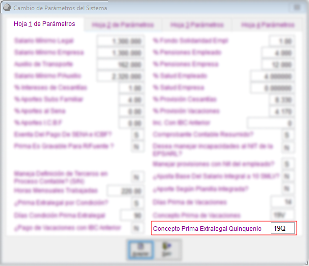 Utilidades – Parámetros del sistema – Condiciones prima extralegal quinquenio