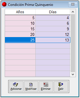 Una vez se relaciona este concepto, se habilita la nueva opción por el menú Utilidades – Parámetros del sistema – Condiciones prima extralegal quinquenio, donde se deben relacionar los días de salario básico que se desean pagar en cada quinquenio: