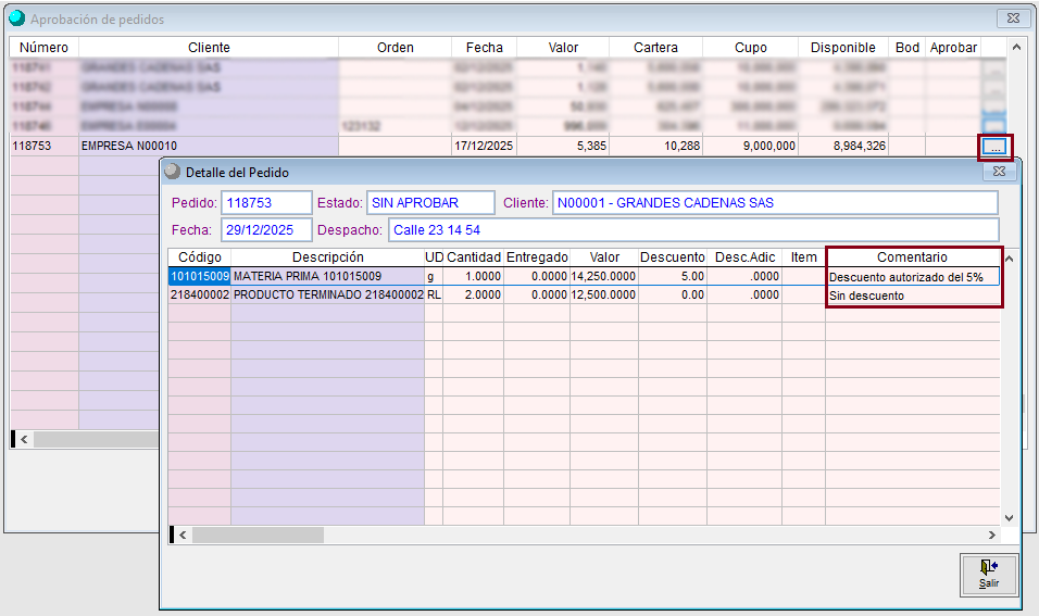 Al ingresar en la opción de aprobación de pedidos y abrir el detalle del pedido, se verá una nueva columna llamada comentario, donde se verá la información digitada en los campos resaltados en la primera imagen: