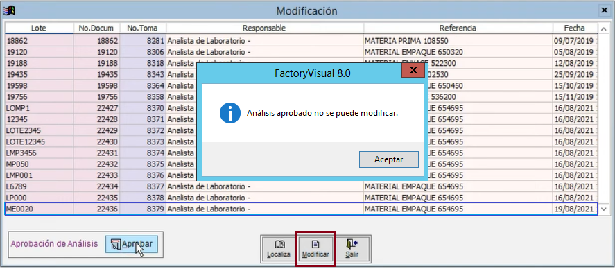 Si se tiene activo el parámetro general ¿Maneja aprobación de análisis? = (S) los análisis que se han aprobado no se pueden modificar: