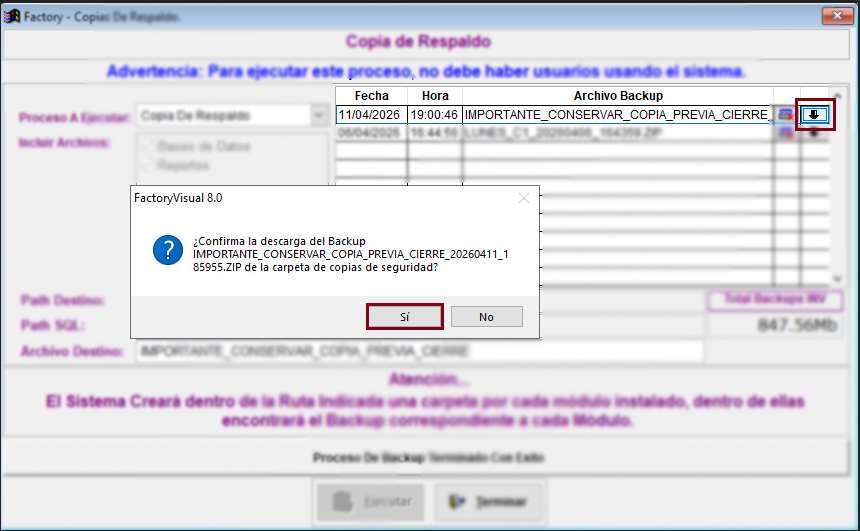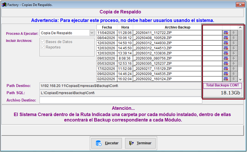 En cada módulo, desde el menú Sistema > Hacer / Restaurar copias, la opción mostrará 2 nuevos botones para 14 módulos y para el módulo de inventarios 3 botones en total si se usa módulo de reproceso de inventarios, los cuales permitirán descargar, eliminar y/o transferir copias de inv a inv1.