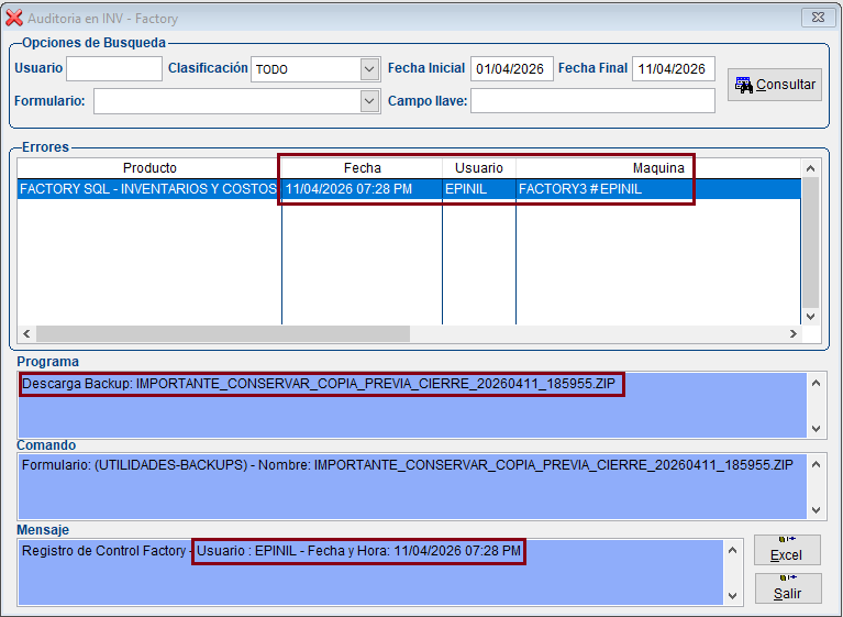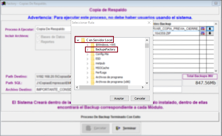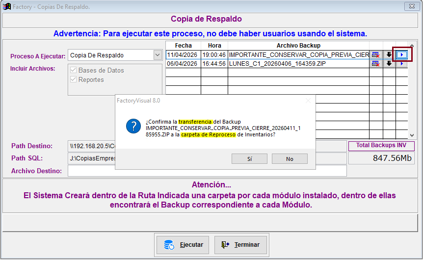 Y en el módulo de inventarios, cuando se tenga instalado el módulo de reproceso de mes, se podrá enviar la copia deseada al directorio de INV1 para su posterior restauración: