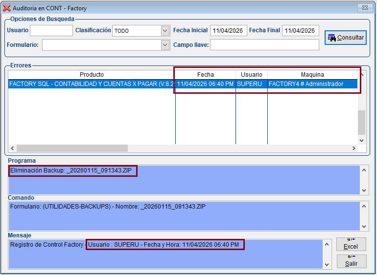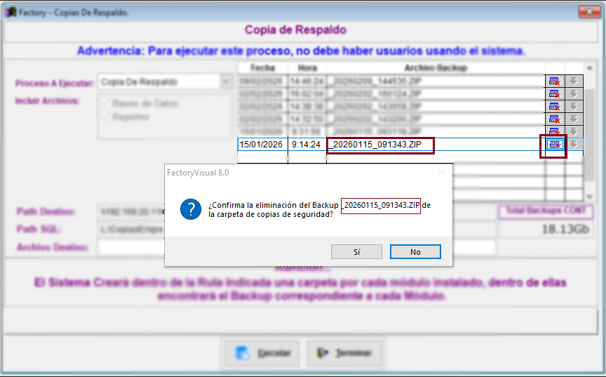 La nueva característica de eliminación de copias, permite al usuario prevenir este tipo de inconvenientes causados por un manejo ineficiente del espacio de almacenamiento, y darle autonomía de eliminar las copias que considere que ya no son necesarias para conservar y dejando disponibles solo las indispensables para la operación del sistema (como las previas al cierre de periodos o copias previas a cambios importantes.) y dejando registro de su eliminación: